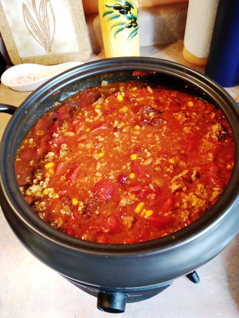 | 1 can (400ml) Kidney Beans 1 can (400ml) Black Beans 1 can (400ml) Pinto Beans 1 can (400ml) Corn –sweet- | add and stir; bring to a boil; simmer, covered for about 60 minutes or slow cook for up to 4 hours. |